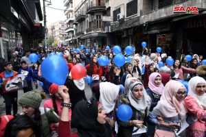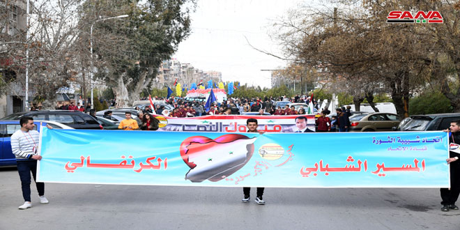 بمشاركة نحو خمسة آلاف شاب وشابة من فروع دمشق وريفها والقنيطرة نظمت منظمة اتحاد شبيبة الثورة اليوم مسيراً شبابياً كرنفالياً بعنوان “حبي الأكبر سورية”.
