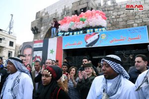 وانطلق المسير الذي شهد مشاركة شبابية وجماهيرية واسعة من ساحة العباسيين وصولاً إلى باب توما عبر المشاركون فيه عن حبهم للوطن وفرحهم بانتصارات الجيش العربي السوري على الإرهاب وعودة الأمان إلى ربوع سورية.