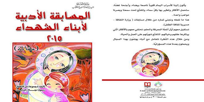 تكريماً لهم على إبداعهم واحتفالاً بالأفكار التي صنعها خيالهم أصدرت الهيئة العامة السورية للكتاب في وزارة الثقافة مؤخرا مجموعة من الكتيبات المخصصة بالمنتوجات الأدبية للأطفال الفائزين في المسابقة السنوية في مجال القصة والشعر والمقالة لعام 2015.