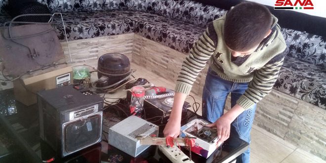وجد الطفل هاشم الحسن من مدينة السويداء في الأجهزة الكهربائية التالفة والقديمة مجالا لإبداعه وإعادة توظيفها في اختراعات بسيطة.