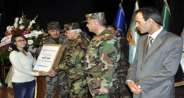 أقامت الإدارة السياسية اليوم برعاية العماد فهد جاسم الفريج نائب القائد العام للجيش والقوات المسلحة وزير الدفاع حفلا تكريميا للطلاب المتفوقين في شهادتي التعليم الأساسي والثانوي بفروعها كافة من أبناء العسكريين العاملين والمتقاعدين في مدارس بنات الشهداء بدمشق حضره عدد من ضباط الجيش والقوات المسلحة وممثلون عن وزارة التربية وحشد من الأهالي.