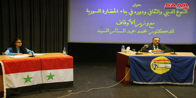 وأشار المحاضر في الندوة الدكتور محمد عبدالستار السيد وزير الأوقاف إلى دور منظمة اتحاد شبيبة الثورة التي تعنى بالشباب ومستقبلهم في بناء سورية المتجددة وإلى التنوع الثقافي والحضاري في سورية الذي يدافع عنه الجيش العربي السوري في معركة اليوم أمام نموذج الإقصاء والإلغاء والتكفير الذي تم توظيفه من الغرب لتدمير الأوطان وتشويه صورة الإنسان.