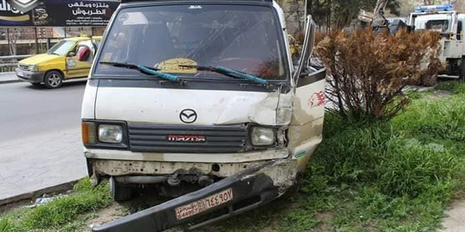 وذكر مصدر في فرع مرور دمشق لمندوبة سانا أن حادثاً مرورياً وقع على طريق الربوة جراء تصادم حافلتين صغيرتين “سرفيس” وسيارة خاصة ما أسفر عن إصابة أحد السائقين وطفل 11 عاماً بجروح متوسطة حيث أسعفا إلى المشفى.