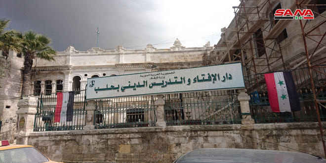 وذكرت المهندسة وسيلة سماني رئيسة مكتب الآثار الوقفية والتراث الإسلامي في مديرية أوقاف حلب بتصريح لمراسل سانا أنه منذ عودة الأمن والاستقرار إلى حلب تم التركيز على دار الإفتاء نظرا لأهميتها الدينية والتاريخية والأثرية لدى الأهالي ورصد آثار الخراب والدمار الذي لحق بها جراء الإرهاب للبدء بأعمال الترميم التي شملت إعادة ترميم وبناء الواجهات الحجرية وتدعيم الأسقف وبناءها بالشكل الذي يناسب طابعها العمراني الأثري وأعمال الإكساء والزريقة الحلبية “الطينة” والكحلة الأثرية.
