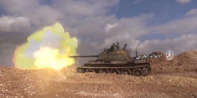 وردت وحدات الجيش أمس على خروقات المجموعات الإرهابية التي استهدفت منطقة مصياف بالقذائف ودكت أوكارهم وتحصيناتهم في محيط اللطامنة والأربعين وكفرزيتا بريف حماة الشمالي وفي بلدات الهبيط والتح وكفرنبل وخان شيخون بريف إدلب الجنوبي.