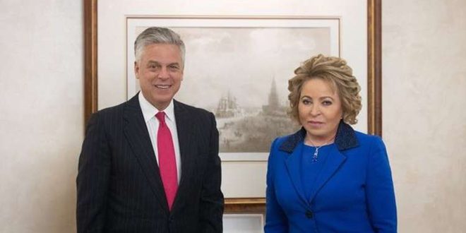 ونقلت روسيا اليوم عن المكتب الإعلامي لمجلس الاتحاد قوله في بيان “إن ماتفيينكو وخلال لقاء جمعها في موسكو مع السفير الأمريكي لدى موسكو جون هانتسمان شددت على أن تدهور العلاقات بين البلدين يتناقض بصورة مباشرة مع مصالحهما ويخلق تهديدات إضافية للأمن والاستقرار الدوليين”.