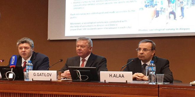 وفي كلمة خلال ندوة مشتركة عقدت في مقر الأمم المتحدة في جنيف بالتعاون بين البعثتين الدائمتين للجمهورية العربية السورية وروسيا الاتحادية لدى الأمم المتحدة في جنيف بحضور مندوب روسيا الدائم لدى الأمم المتحدة في جنيف غينادي غاتيلوف بعنوان “الوضع الإنساني في سورية تقارير شهود عيان” أوضح السفير آلا أن تحرير الأحياء الشرقية لمدينة حلب ومناطق الغوطة الشرقية من إرهابيي “جبهة النصرة” والمجموعات الإرهابية المتحالفة معه كشف بالوثائق والمعلومات العلاقة العضوية التي تربط منظمة “الخوذ البيضاء” بالمجموعات الإرهابية ودورها في فبركة مزاعم قصف المواقع المدنية واستخدام الأسلحة الكيميائية في مناطق مختلفة من سورية.