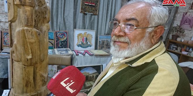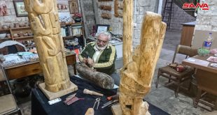 حلب-سانا يبدع الفنان النحات عبد القادر منافيخي في تحويل كتل الحجر وقطع الشجر إلى مجسمات …