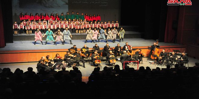وجاءت أمسية اليوم وعبر 70 دقيقة لوحة متكاملة بين النغمة الموسيقية والكلمة والدبكات والرقص الشعبي من روح منطقة القلمون لأغاني الطفولة من جوقتي “ألوان وورد” وأغاني الحب من كورال “شام”.