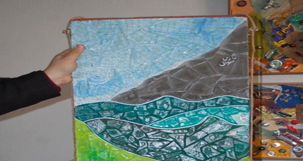 وتضم الورشة أطفالاً دون 12 عاما وقد قامت بتصميم أول لوحاتها الفنية والتي هي عبارة لوحة من بقايا بلور النوافذ المحطم بمقاس 100ضرب 40 سم وتم تقديمها لتربية حماة لتعرض ضمن المعارض التي تقام في المحافظة.