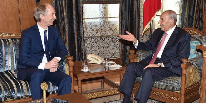 بحث رئيس مجلس النواب اللبناني نبيه بري اليوم مع المبعوث الخاص للأمين العام للأمم المتحدة إلى سورية غير بيدرسون تطورات الأوضاع في لبنان والمنطقة وقضية عودة المهجرين السوريين إلى وطنهم.