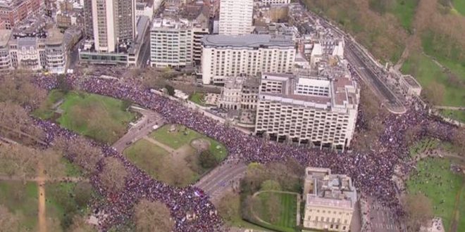 وتأتي هذه المظاهرات بعد يومين من إعلان قمة الأزمة التي عقدها قادة الاتحاد الأوروبي فى بروكسل بأن بريطانيا قد تغادر التكتل دون اتفاق فى الـ 12 من نيسان إذا رفض مشرعوها الأسبوع المقبل التصديق على الاتفاق المعدل الذي توصلت إليه رئيسة الوزراء تيريزا ماي مع بروكسل.