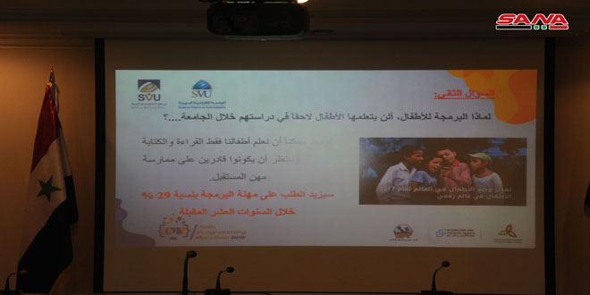 وقدمت المهندسة مايا تقي مديرة البرنامج التدريبي البرمجي للأطفال واليافعين في الجامعة الافتراضية عرضاً حول الماراثون البرمجي للأطفال واليافعين لعام 2019 وآفاقه وأكدت أن أهم أهدافه هو رفع المستوى العلمي العام وتعزيز مهارات التحليل المنطقي والتفكير الإبداعي لدى جميع الأطفال واليافعين في جميع المحافظات ودعم المجتمع وتقديم محتوى مفيد في مجال البرمجة والمعلوماتية وتنمية الطلاقة في التعامل مع تقانة المعلومات.