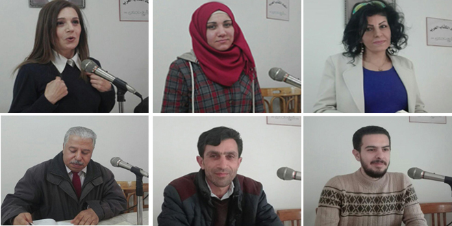 الشاعرة خديجة الحسن عبرت خلال قصيدة غزلية ألقتها حملت عنوان “تبقى الروح” عن معاناة ذاتية كان الحب سببها أما قصيدة الشاعر عبد الكريم يحيى عبد الكريم التي حملت عنوان “رقص من نوع خاص” عبر خلالها عن عظيم الألم الذي ألم بمدينته حمص جراء ما طالها من إرهاب.