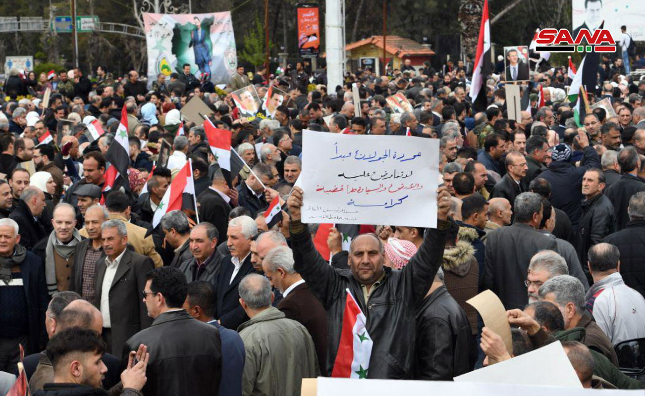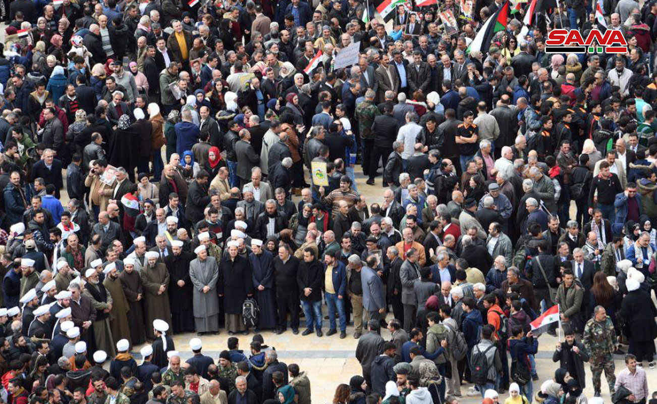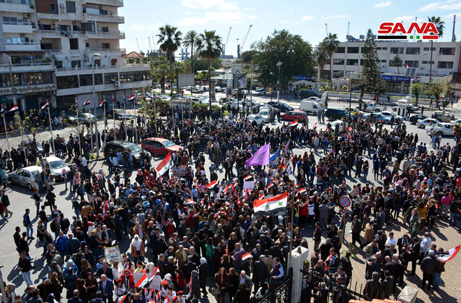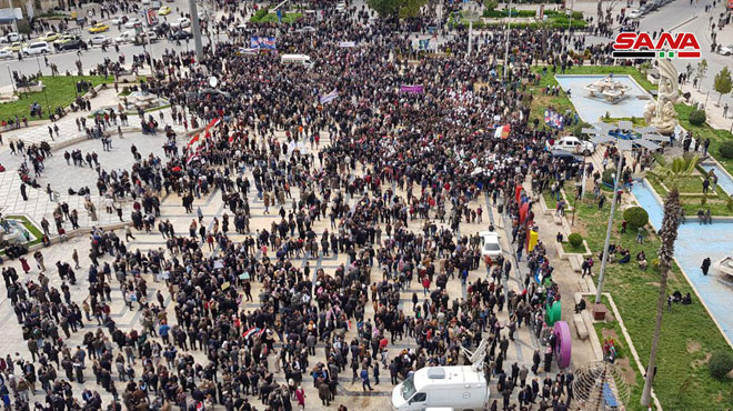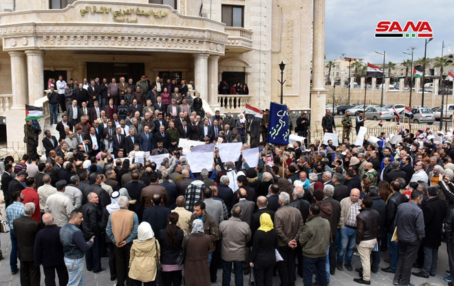 احتشد الآلاف من أهالي اللاذقية بفعالياتهم المختلفة أمام مبنى المحافظة اليوم للتنديد بإعلان الرئيس الأمريكي دونالد ترامب حول الجولان العربي السوري المحتل.