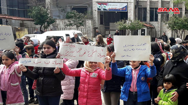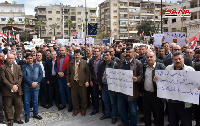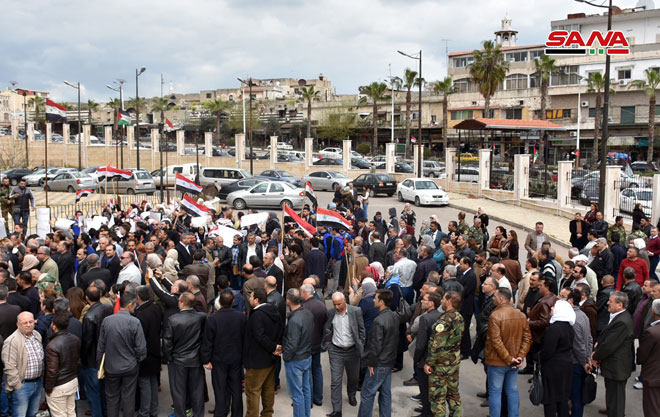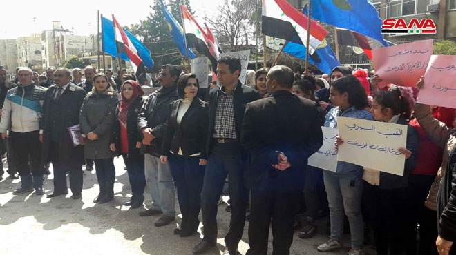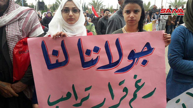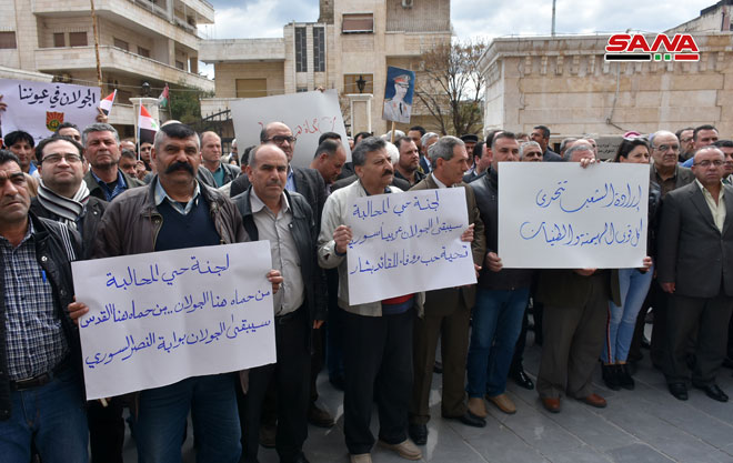 نظم السوريون على امتداد ساحات الوطن وقفات احتجاجية تنديداً باعلان الرئيس الأمريكي دونالد ترامب حول الجولان العربي السوري المحتل وتأكيداً على هويته الوطنية وعودته للوطن الأم سورية.