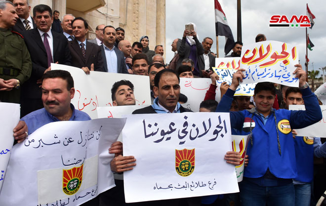 ونفذت الفعاليات الرسمية والشعبية في محافظة حماة وقفة احتجاجية أمام مقر فرع حماة لحزب البعث العربي الاشتراكي بالمدينة تنديدا بإعلان الرئيس الأميركي دونالد ترامب الاعتراف بضم الجولان السوري المحتل للكيان الإسرائيلي.