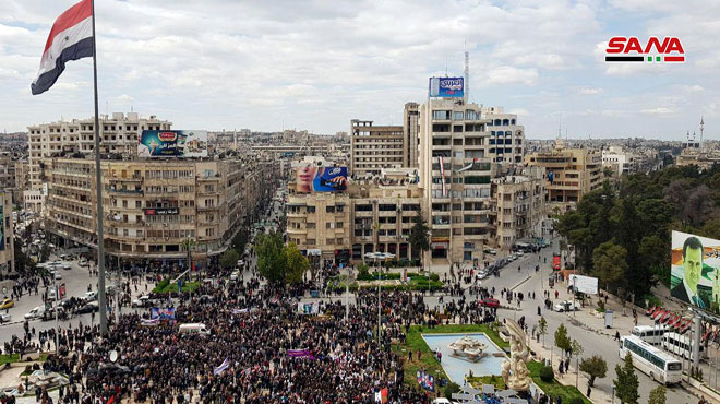وفي حلب احتشد أهالي محافظة حلب بمختلف فعالياتهم اليوم في ساحة سعد الله الجابري للتنديد بإعلان الرئيس الامريكي دونالد ترامب ضم الجولان السوري المحتل إلى كيان الاحتلال الصهيوني مؤكدين أن الجولان المحتل جزء لا يتجزأ من ارض سورية .