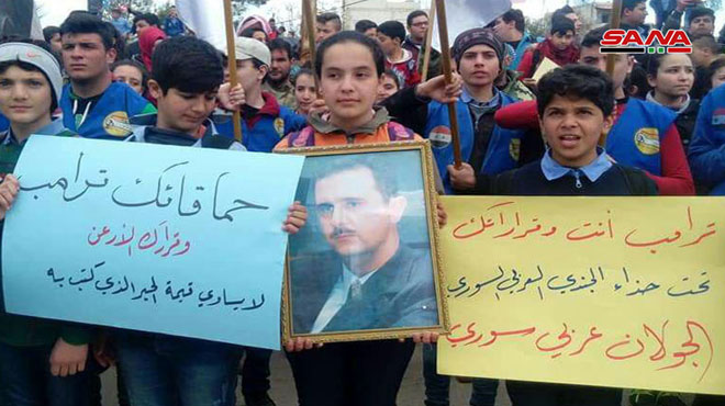 وعبر الأهالي الذين رفعوا الأعلام واللافتات الوطنية عن رفضهم القاطع وإدانتهم لإعلان ترامب مشيرين إلى أن السوريين الذين صمدوا خلال 8 سنوات أمام أعتى الحروب الإرهابية وداعميها وانتصروا فيها لن تثنيهم إعلانات باطلة عن استعادة حقوقهم وأرضهم المحتلة ودحر المحتلين منها.
