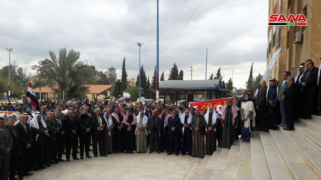 وفي الحسكة نظمت الفعاليات الرسمية والشعبية وقفة استنكار وتنديد بإعلان ترامب وللتأكيد على هوية الجولان السورية.