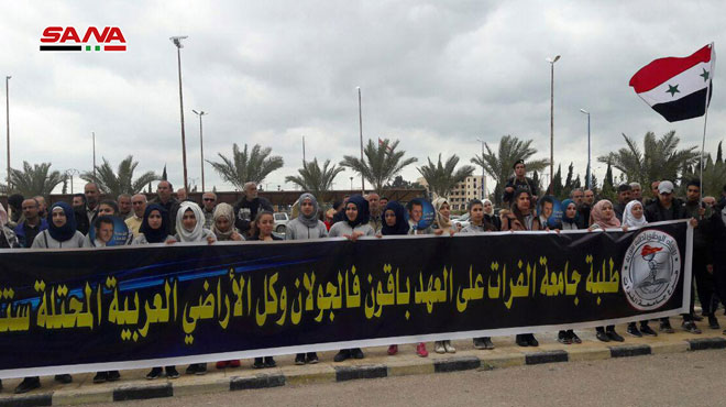 وفي سياق متصل نظمت جامعة الفرات وفرع الاتحاد الوطني لطلبة سورية بدير الزور وقفة احتجاجية مماثلة في كلية الآداب والعلوم الانسانية.