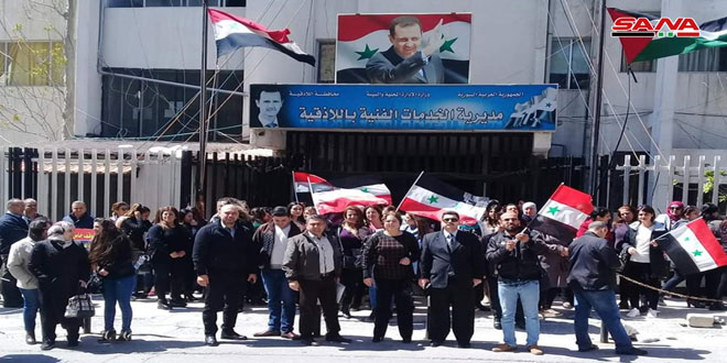 ندد أطباء الأسنان في اللاذقية خلال وقفة احتجاجية اليوم بإعلان الرئيس الأمريكي دونالد ترامب الاعتراف بضم الجولان السوري المحتل إلى الكيان الصهيوني مؤكدين أن الجولان المحتل سيبقى سوريا بشعبه وترابه وتاريخه الذي يرفض الاحتلال.