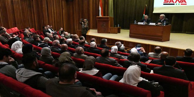 وشارك في المحاضرة قادة من الفصائل الفلسطينية وممثلو أحزاب وقوى وهيئات سورية وفلسطينية ومن سفارات الجزائر والعراق والسودان وإيران.