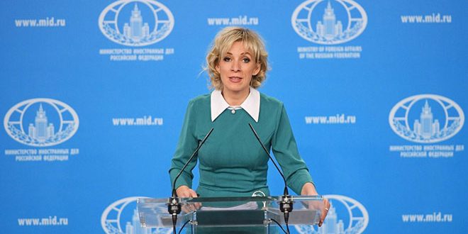 وانتقدت زاخاروفا البيان الصادر عن الولايات المتحدة وبريطانيا وفرنسا مؤخرا لتعمد هذه الدول تجاهل التطورات الإيجابية واستقرار الوضع في سورية وتسييس مسألة عودة المهجرين.