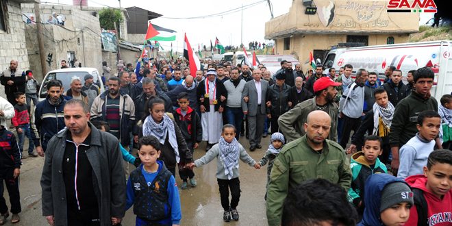 نظمت فصائل المقاومة الفلسطينية اليوم مسيرتين جماهيريتين إحياء للذكرى الثالثة والأربعين ليوم الأرض ورفضا لإعلانات الرئيس الأميركي دونالد ترامب الجائرة حول القدس العربية والجولان السوري المحتل وذلك في مخيمي جرمانا وخان دنون بريف دمشق.