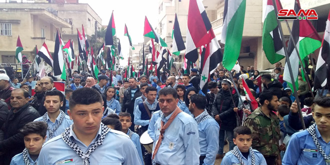 نظمت الفصائل الوطنية الفلسطينية في مخيم العائدين في اللاذقية اليوم مسيرة شعبية بمناسبة ذكرى يوم الأرض ووقفة احتجاجية تنديداً بإعلان الرئيس الأمريكي دونالد ترامب حول الجولان السوري المحتل.