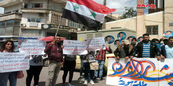وفي محافظة السويداء جددت الفعاليات والمنظمات الشبابية في وقفة احتجاجية نظمتها اليوم أمام مبنى المركز الإذاعي والتلفزيوني رفضها وتنديدها بإعلان ترامب حول الجولان المحتل .