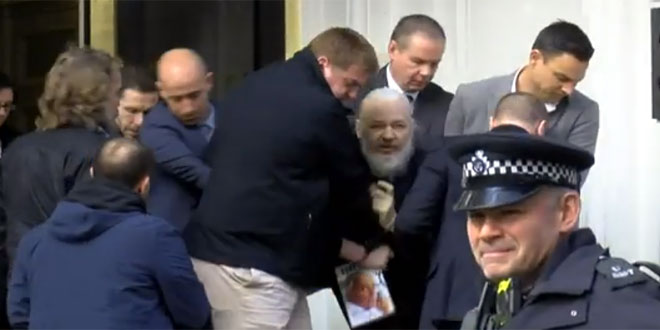 اعتقلت الشرطة البريطانية اليوم جوليان أسانج مؤسس موقع ويكيليكس في سفارة الإكوادور إثر طلب الولايات المتحدة اعتقاله بسبب دوره في تسريب مئات الوثائق السرية عن المخططات الأمريكية.