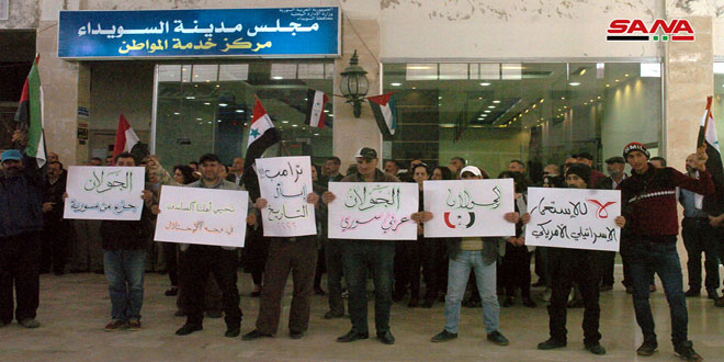 نفذ العاملون بمجلس مدينة السويداء اليوم وقفة احتجاجية تنديداً بإعلان الرئيس الأمريكي دونالد ترامب حول الجولان العربي السوري المحتل وتضامناً مع أهلنا الصامدين فيه.