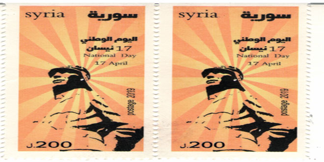 أصدرت المؤسسة السورية للبريد طابعاً بريدياً تذكارياً بقيمة 200 ليرة سورية بمناسبة اليوم الوطني لسورية “عيد الجلاء” الذي يصادف يوم الأربعاء القادم في الـ 17 من نيسان.