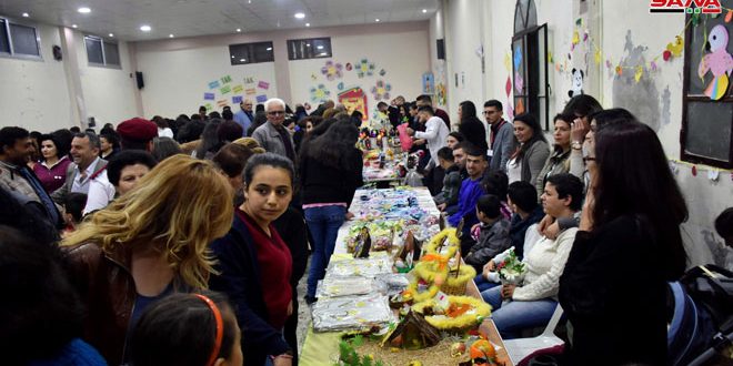 يزخر المعرض الفصحي الذي تقيمه مطرانية الروم الأرثوذكس في مركز بيت الفرح بمقر كنيسة النبي يوحنا المعمدان في بلدة قطينة في ريف حمص بالعديد من الأعمال الفنية والاشغال اليدوية وزينة العيد من صنع ذوي الاحتياجات الخاصة بمساعدة الأهل والقائمين عليهم.