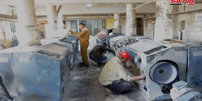وتعمل المطحنة حاليا على خط إنتاج بطاقة تتراوح بين 70 و80 طنا وخط جديد بطاقة يومية تصل إلى 30 طنا ليصل الإنتاج اليومي الحالي لنحو 110 أطنان فيما يتم تأمين باقي الكمية من الشركة العامة للمطاحن بدمشق.