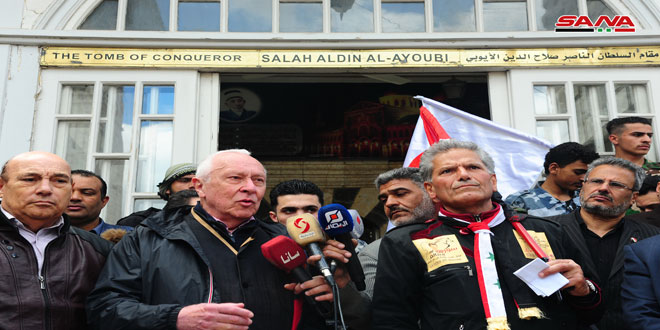 وأوضح غورو خلال زيارته ضريح صلاح الدين الأيوبي أنه حضر إلى سورية مع مجموعة من الكتاب المرموقين في فرنسا ليمثل مئات الآلاف من الفرنسيين الذين يعتقدون ويؤمنون ويقومون بعشرات اللقاءات الأكاديمية والمحاضرات والندوات لتوعية الشعب الفرنسي ضد الإرهاب الإعلامي في فرنسا والتخفيف من حدة المواقف السياسية الفرنسية المعادية لسورية معربا عن أمله أن تتصرف القيادة الفرنسية بعقلانية “وتمد يدها إلى الشعب السوري فهناك الكثير من القواسم التي تجمع الفرنسيين والسوريين”.