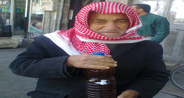 رغم بلوغه 81 عاما ما زال العم عبد الغفور الخالد من أهالي قرية هريرة الجبلية في وداي بردى يمارس عمله الذي اعتاده يوميا حيث يقوم ببيع الخل الذي صنعه في منزله