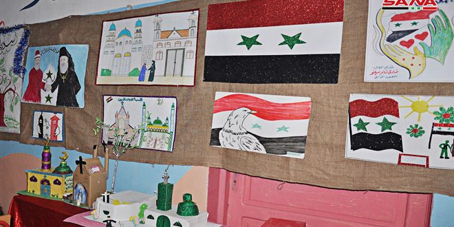 وشملت المعروضات رسومات ولوحات فنية ومجسمات كرتونية عبر من خلالها الطلاب عن حبهم لوطنهم وتمسكهم بأرضهم واعتزازهم بتضحيات وبطولات بواسل الجيش العربي السوري في مواجهة الحرب الإرهابية التي تشن على سورية.