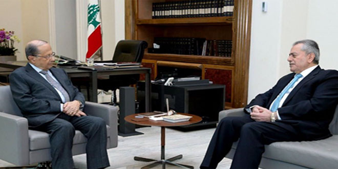 بحث الرئيس اللبناني العماد ميشال عون خلال استقباله في قصر بعبدا اليوم سفير سورية في لبنان علي عبد الكريم العلاقات الثنائية بين البلدين والمستجدات على الساحتين الإقليمية والدولية.