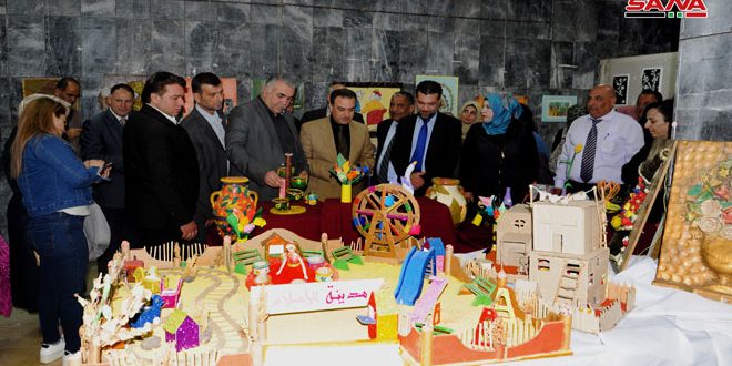 لوحات فنية وأعمال من توالف البيئة ضمها المعرض الفني الذي أقامته دائرة المسرح المدرسي والأنشطة الفنية في مديرية تربية درعا اليوم بصالة المركز الثقافي بمدينة درعا.
