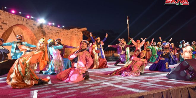 وبدأ المهرجان عروضه بعمل فني استعراضي بعنوان “بيارق النصر” أدته فرقة “آرام” للمسرح الراقص بمشاركة عدد من نجوم الدراما السورية منهم الفنان محمد قنوع والفنانة روبين عيسى واستعراض العربات الكرنفالية وعروض الفرسان والفرق الفلكلورية والعراضات الشعبية ومشاهد ومجسمات تجسد الملاحم البطولية للشعب السوري في مختلف الحقب التاريخية تأكيدا على مواصلة التضحيات والبطولات من خلال متابعة الانتصارات ضد التنظيمات الإرهابية المسلحة حتى دحرها عن كامل التراب السوري.
