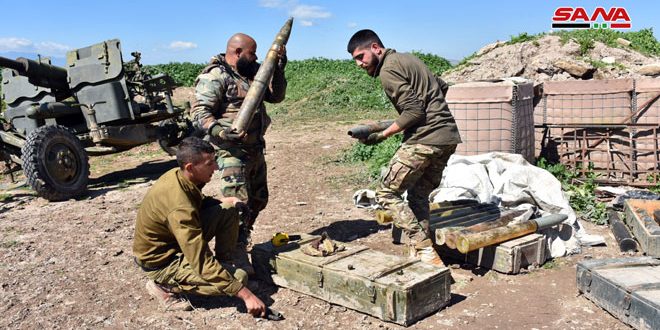 وأفاد مراسل سانا في حماة بأن “وحدات الجيش ومن خلال عمليات الرصد دكت بضربات مركزة بسلاح المدفعية مقرات وتجمعات لإرهابيي تنظيم جبهة النصرة في قريتي الحواش وقلعة المضيق بالريف الشمالي الغربي لحماة” مشيرا إلى أن “ضربات الجيش أوقعت إصابات مؤكدة في صفوف الإرهابيين ودمرت لهم أوكارا ومواقع محصنة”.