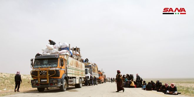 وذكر مراسل سانا من ممر جليغم أنه في إطار الجهود التي تبذلها الدولة لإعادة المهجرين السوريين إلى مناطقهم التي حررها الجيش العربي السوري من الإرهاب وصلت اليوم مئات الأسر السورية التي كانت تحتجزهم قوات الاحتلال الأمريكية ومرتزقتها من المجموعات الإرهابية في مخيم الركبان .