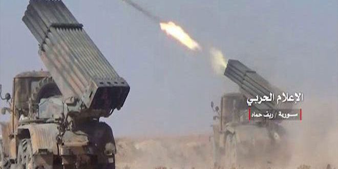 وذكر مراسل سانا في حماة أن وحدات من الجيش دمرت بضربات مكثفة أوكارا ومنصات إطلاق صواريخ لإرهابيي “جبهة النصرة” في اللطامنة والزكاة ردا على اعتدائهم بالصواريخ على القرى الآمنة بالريف الشمالي.