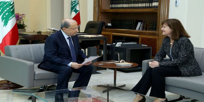 وطالب عون خلال استقباله اليوم في قصر بعبدا وفدا من مجلس كنائس الشرق الأوسط برئاسة الأمينة العامة للمجلس ثريا إيلي بشعلاني بمساعدة لبنان في مسألة عودة المهجرين السوريين إلى بلدهم بأسرع وقت ممكن إضافة إلى عودة اللاجئين الفلسطينيين إلى ديارهم.