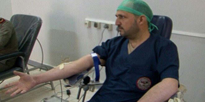 تقديرا لتضحياتهم في الدفاع عن الوطن نظم العاملون في مديرية صحة القنيطرة ومشفى الشهيد ممدوح اباظة وقوى الامن الداخلي حملة تبرع بالدم في وحدة قطف الدم بمشفى الشهيد ممدوح اباظة بمدينة البعث.