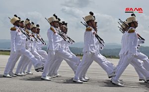 وتضمن الاحتفال عرضا عسكريا شاركت فيه وحدات عسكرية سورية وروسية وعرضا بالعتاد والسلاح وبعدها تم وضع إكليلين من الورد على ضريح الجندي المجهول في قاعدة حميميم وتكريم عدد من الضباط والجنود الروس من العاملين في سورية.