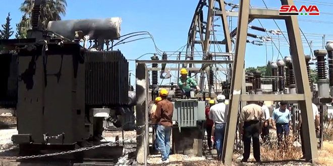 حماة-سانا أعادت ورشات الصيانة في الشركة العامة للكهرباء بمحافظة حماة محطة تحويل كهرباء الشريعة