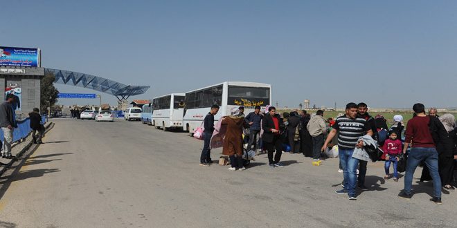 وذكرت مراسلة سانا في درعا أنه في إطار الجهود الحكومية لإعادة المهجرين بفعل الإرهاب عادت اليوم دفعة منهم عبر مركز نصيب الحدودي قادمة من مخيم الأزرق في الأردن ليصار نقلهم إلى قراهم ومناطق سكنهم الدائم التي طهرها الجيش العربي السوري من الإرهاب.